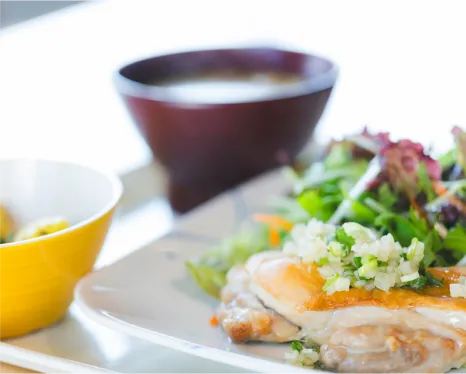自慢の社員食堂でランチ体験。淡路島で採れた食材をふんだんに使用した社食は、1年間毎日違うメニューです。