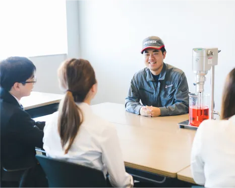 プライミクスの会社のことを知っていただくことはもちろん、実際の機械を触っていただき当社の攪拌技術を通して「混ぜる」とは何かを学んでいただきます。