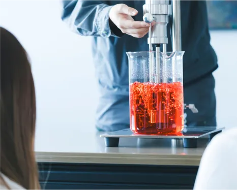実際に機械に触れて「攪拌」を体験していただきます。プライミクスの機械を使い、「つかめる水」を作成し、手で混ぜた場合と機械を用いて混ぜた場合の液の違いを観察。なぜプライミクスの機械はきれいに混ぜることができるのか、また、なぜきれいに混ぜる必要があるのかについて、プライミクスの第一線で働く研究所の社員が詳しくお答えします。